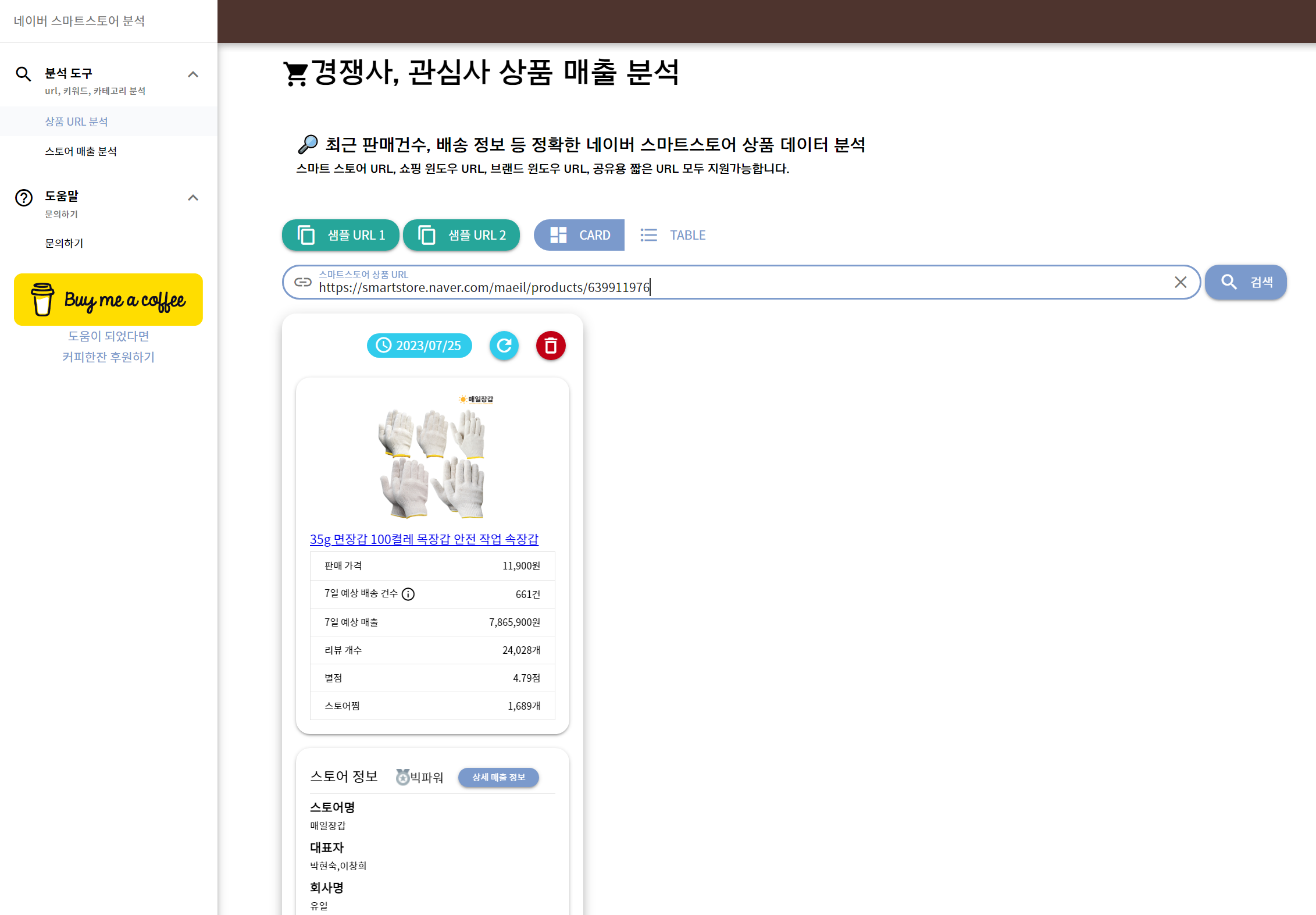 - 네이버 스마트 스토어 상품 개수, 3일 매출, 6개월 매출 1년 매출 표시